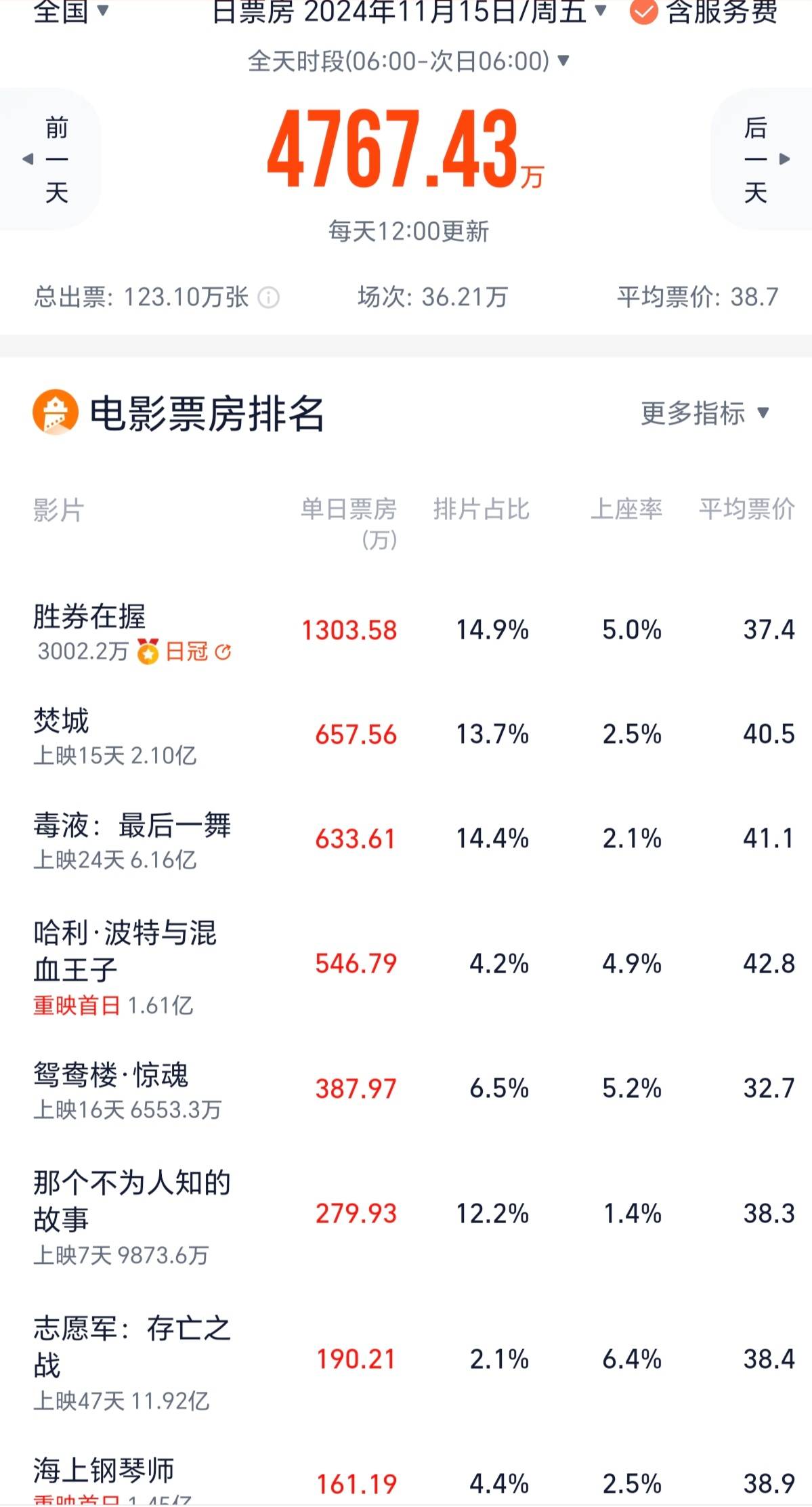 《哈利·波特》系列第六部《哈利·波特与混血王子》重映首日排片4.2%,收票房547万元。该系列每周一部重映,前五部《哈利·波特与魔法石》《哈利·波特与密室》《哈利·波特与阿兹卡班的囚徒》《哈利·波特与火焰杯》《哈利·波特与凤凰社》截止目前的重映累计票房分别为7570万元、4464万元、4222万元、3373万元、2596万元。