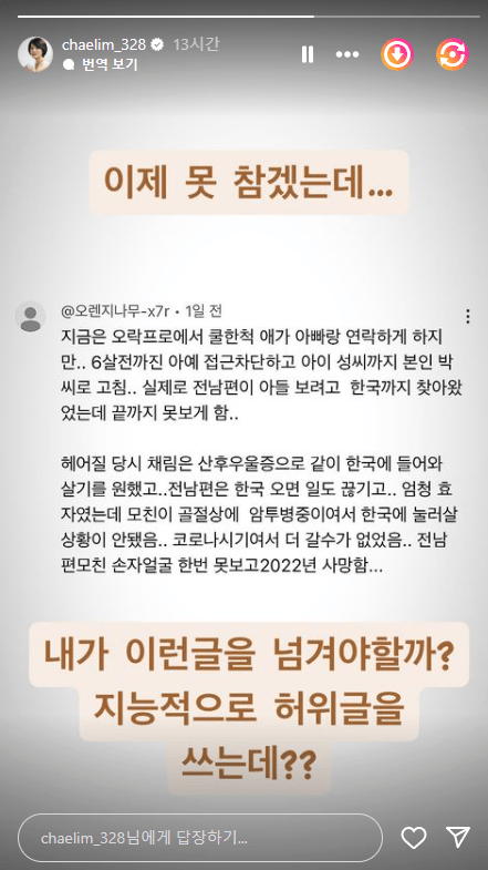 蔡琳之所以愤怒,是因为这位网友表示,蔡琳在节目中假装让儿子和父亲联系,其实6年来一直禁止前夫接近,儿子的姓氏也改成了朴,前夫为了见儿子来韩国,她一直不让见。