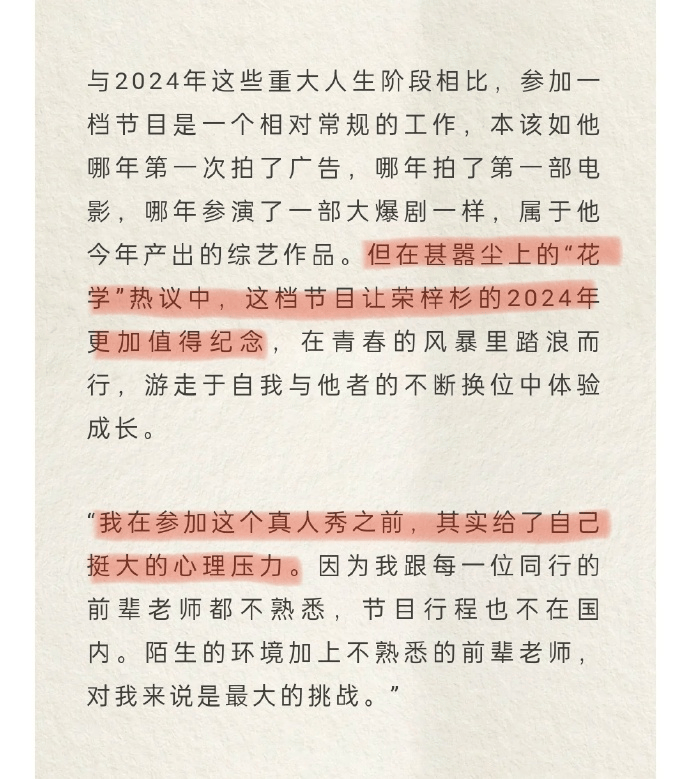 据悉,荣梓杉在综艺《花儿与少年6》中的表现一度引起网友热议,其中不乏负面评论。