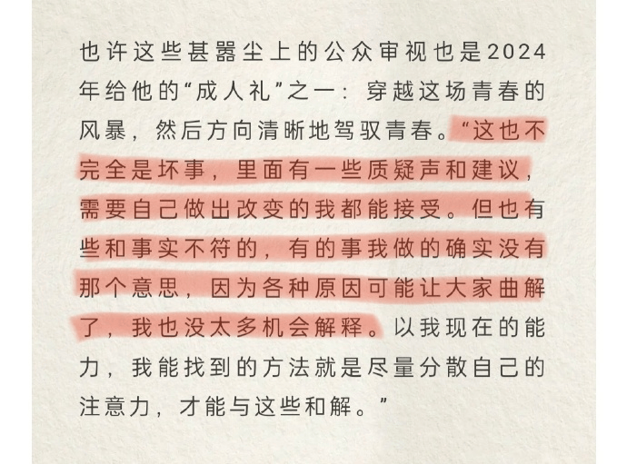 同时,他也表示:“里面有一些质疑声和建议,需要自己做出改变的我都能接受。但也有些和事实不符的,有的事我做的确实没有那个意思,因为各种原因可能让大家曲解了,我也没太多机会解释。”