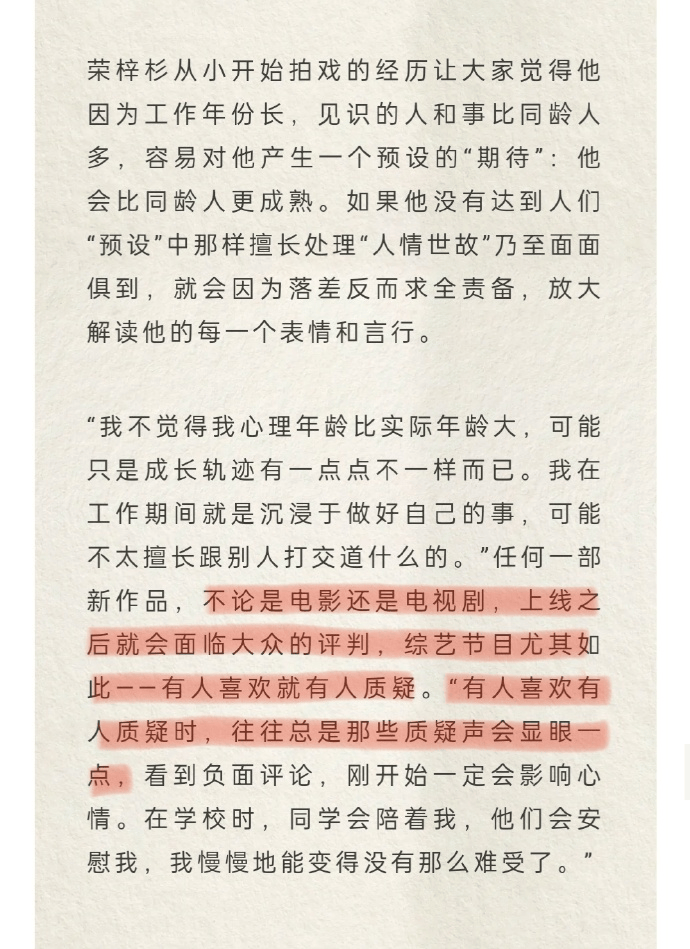 搜狐娱乐讯 近日,荣梓杉回应了观众对他在《花少6》中表现的评价:“不论是电影还是电视剧,上线之后就会面临大众的评判,综艺节目尤其如此,有人喜欢就有人质疑,往往总是那些质疑声会显眼点”。
