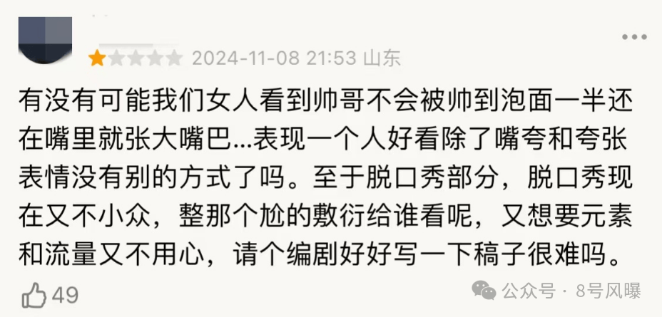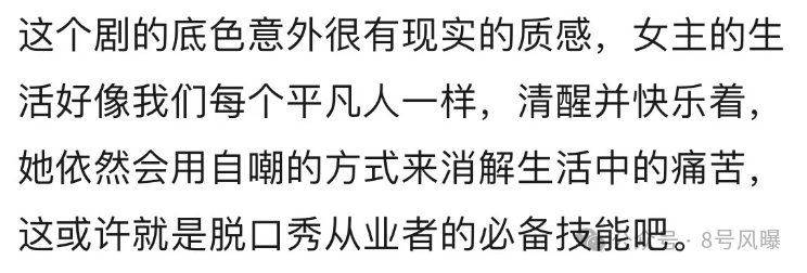 而男女主之间的感情催化剂——脱口秀部分也展现得差点意思,不少观众认为剧中的脱口秀内容并不好笑,笑点十分尴尬,不能称之为脱口秀。