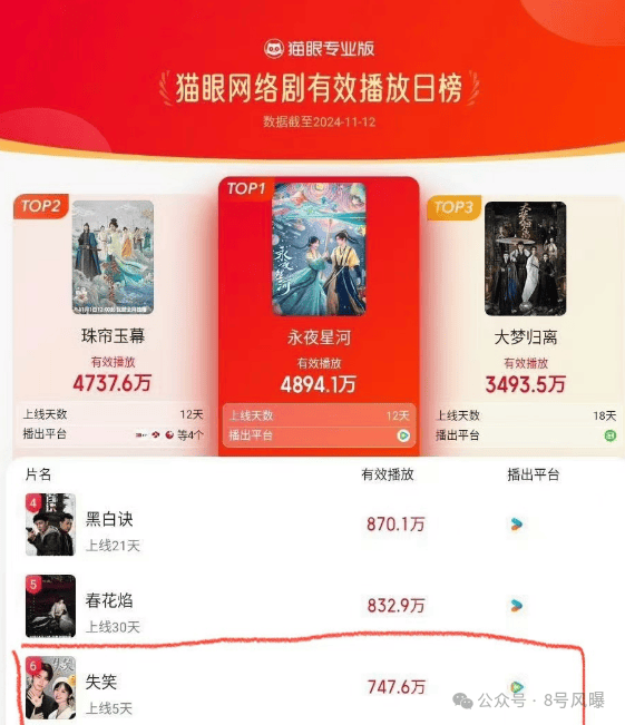 截止到11月12日,该剧上线5天,腾讯站内热度破21000,根据最新云合和猫眼数据显示,《失笑》市场占有率仅为3%,有效播放量为747.6万。
