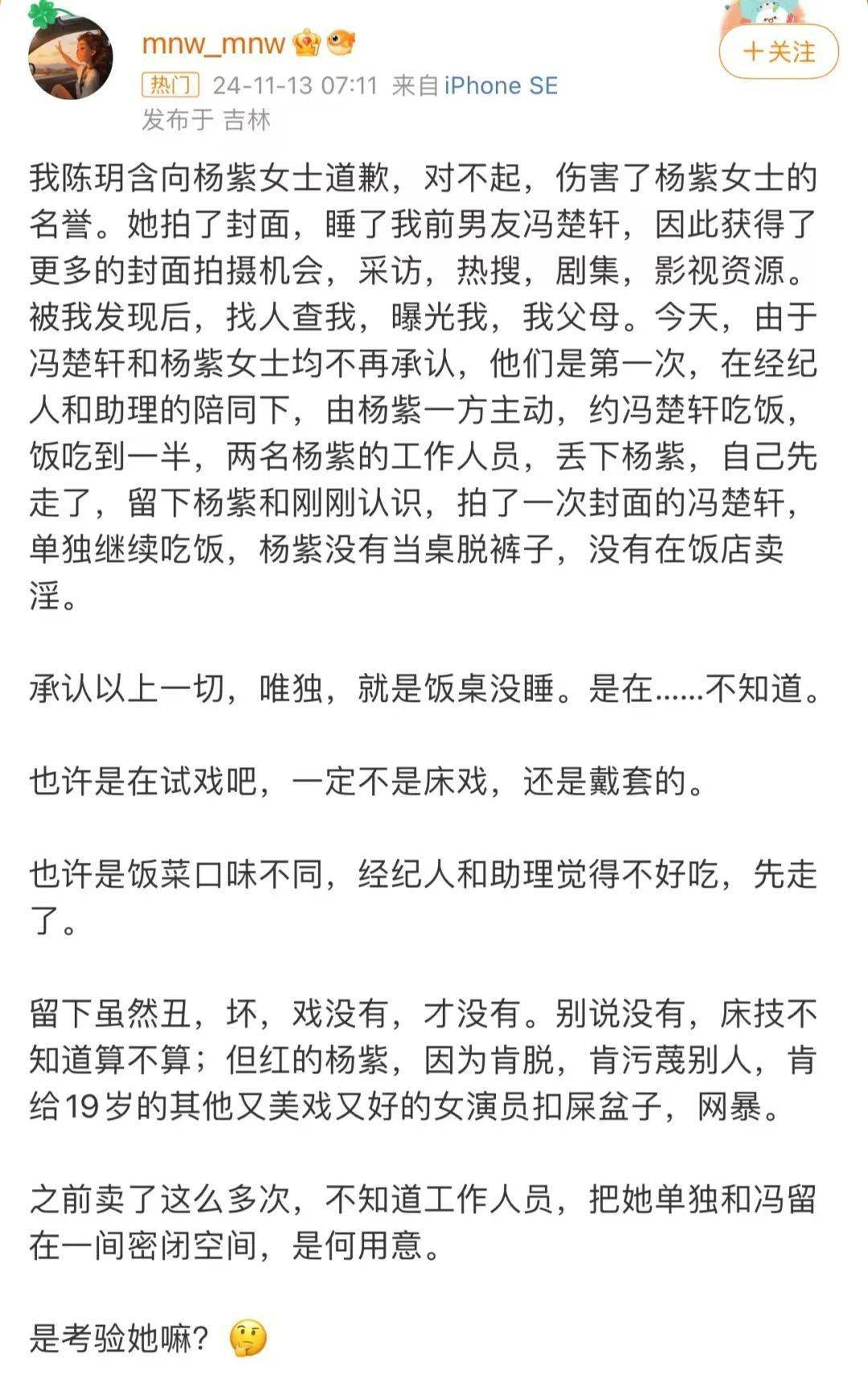 就是有一网友发文,说杨紫因为拍封面睡了她前男友冯楚轩,以此换取更多的封面拍摄机会,采访,热搜,剧集,影视资源。其中有关杨紫和冯楚轩的描述还相当辣眼睛,就是遣词造句有点前言不搭后语。