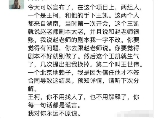 高群书在其中一篇朋友圈指名道姓的怒斥制片人,表示开会时制片人王柯的手下王凯抱怨赵冬苓的“剧本太老”,而高群书则坚持剧本一字不改,并扬言“觉得剧本不好就别做了。”王凯应该是从那时候就开始和高群书产生矛盾,几次提出把他换掉。