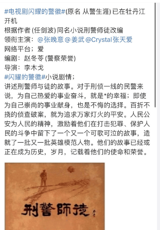 有消息称,张晚意、姜武、张天爱主演的电视剧《闪耀的警徽》于11月9日在牡丹江开机。