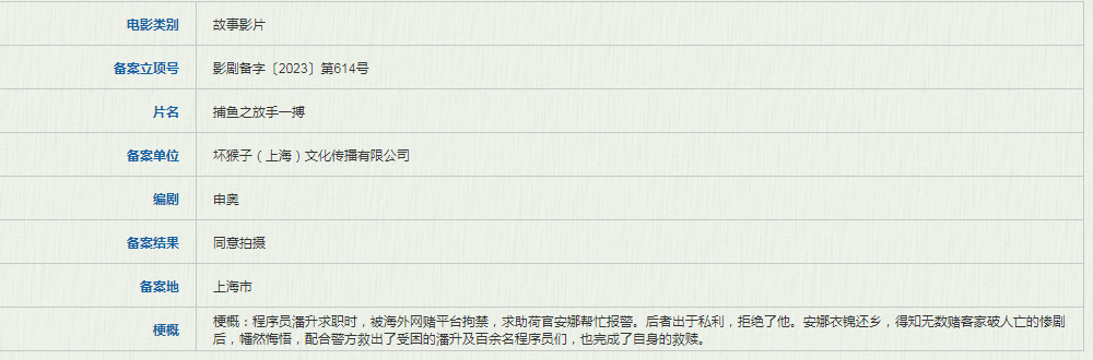 还有去年的热门电影《孤注一掷》,早在2021年就拍摄完成,但直到2023年初才备案立项,当时的片名还是“捕鱼之放手一搏”。
