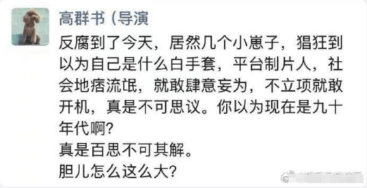 高群书另外一条朋友圈,则是揭露制片方“违规”操作,不立项就开机“真是不可思议。你以为现在是九十年代啊?胆儿怎么这么大?”