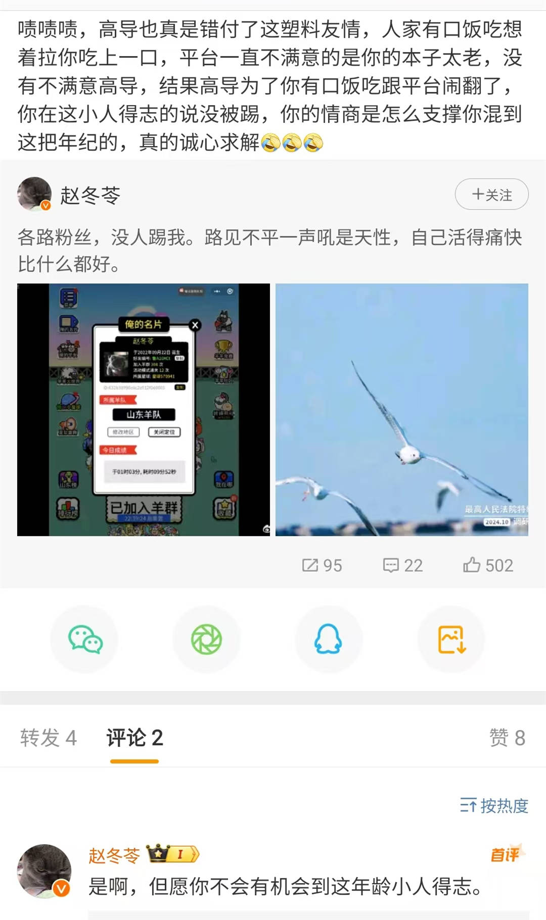 面对这样的转发留言内容,赵冬苓做出如下回复: