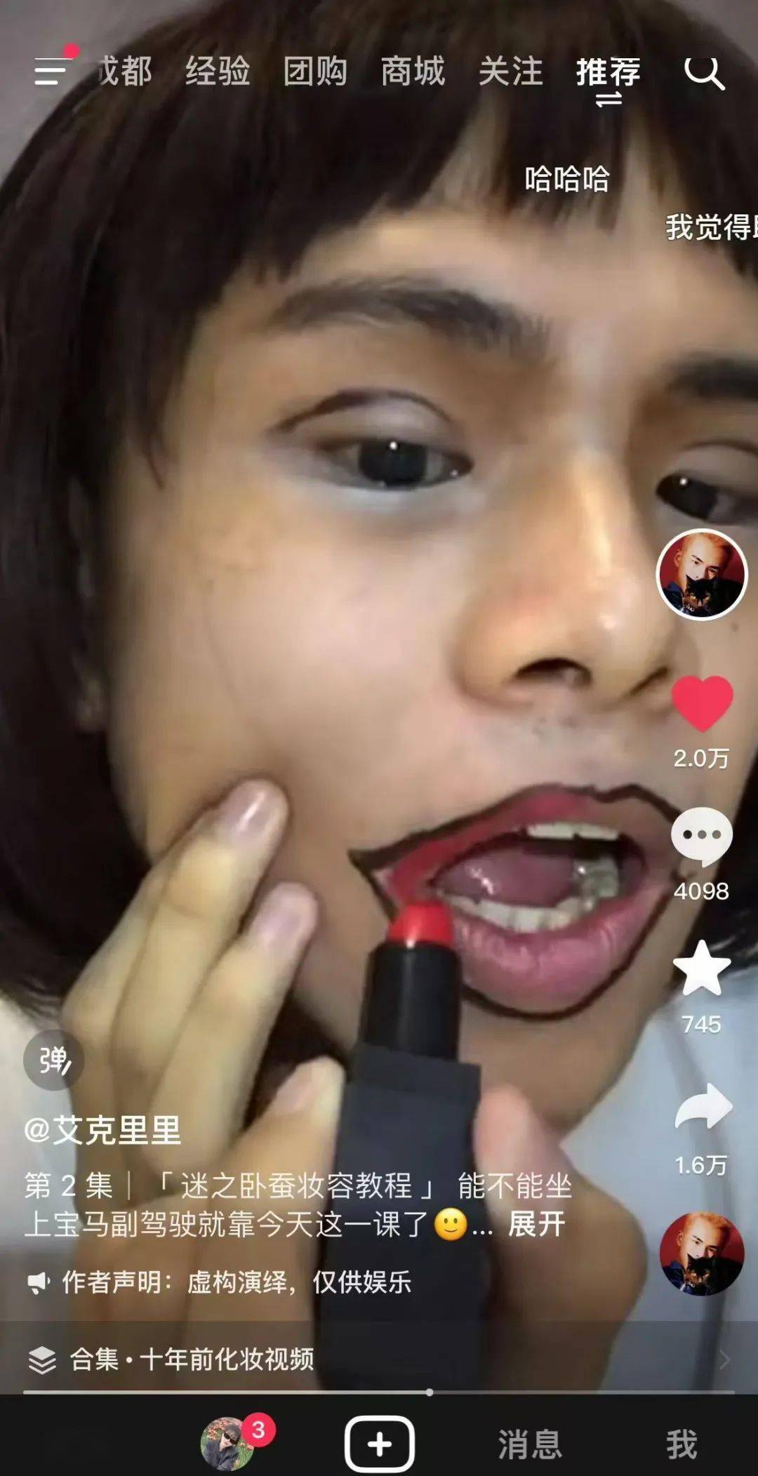 ▲早期的“艾克里里”用简单粗暴的方式做妆容教程,是第一个用这种方式出圈的美妆博主。如今抖音上许多靠“丑”出圈的美妆博主,都有模仿他的影子。