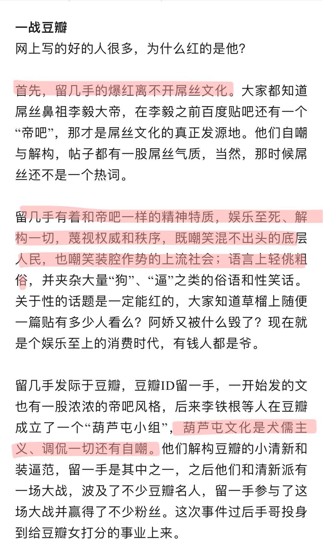 那时的“留几手”传承了和帝吧一样的精神特质:“娱乐至死、解构一切,蔑视权威和秩序”,语言上轻佻粗俗,夹杂着大量网络俗语和性玩笑。与性沾边的内容有天然便于传播的特点,再加上他敢言他人之不敢言,一定程度上成为公众情绪的发泄出口。