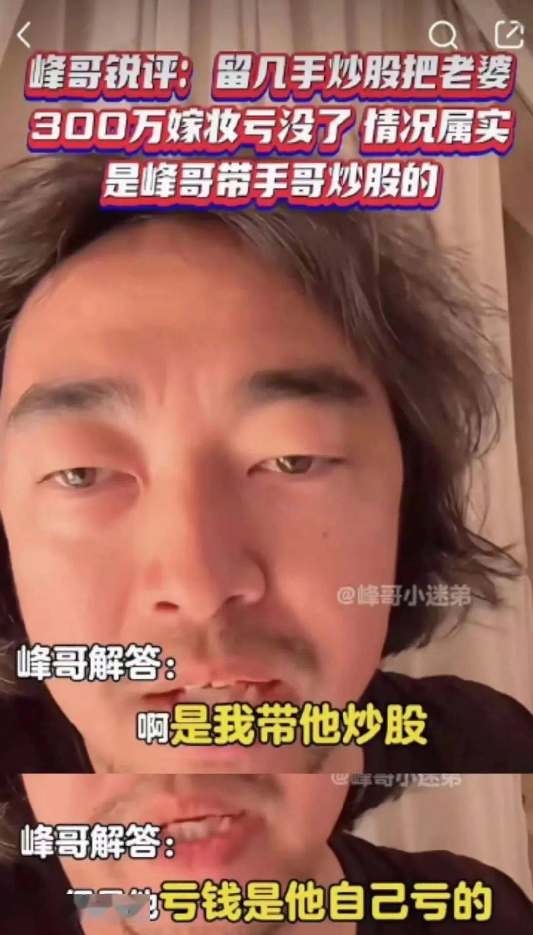 ▲本就热爱赌球的“留几手”又在以前的助理周丽峰的带领下开始学习炒股,据“留几手”老粉所说,葛夕非常不喜欢刘爽这个朋友,正是因为他,“留几手”才会损失上千万的财产。周丽峰承认刘爽亏掉了葛夕的嫁妆。