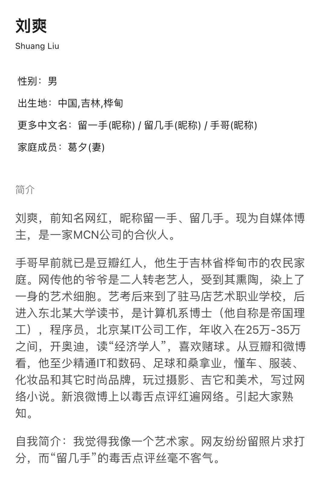 直到他越来越出名,人们才知道他的真名叫刘爽,昵称“留一手”,1980年代出生于东北吉林。