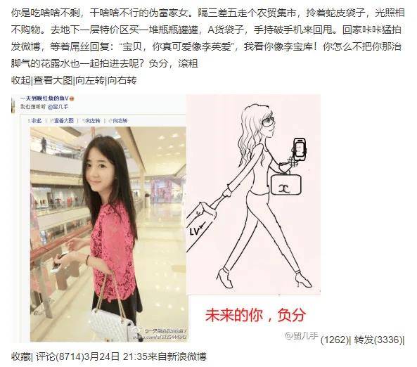 有的时候,他还会给照片配上漫画或者另一张联想的图片,让人忍俊不禁。有趣的是,他主打一个“虐骂式点评”,负分、零分众多,只有极少数得到正分。一般高分会偏向打扮清纯自然的“森女风”,大多数都被批评得可谓“体无完肤”。