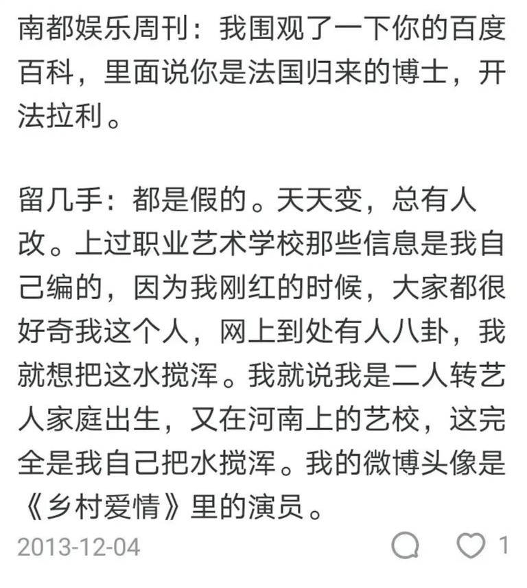 ▲2013年刘爽曾接受过《南都娱乐周刊》的采访,说自己关于“驻马店艺术职业学校”、“帝国理工”博士学习经历都是玩梗。