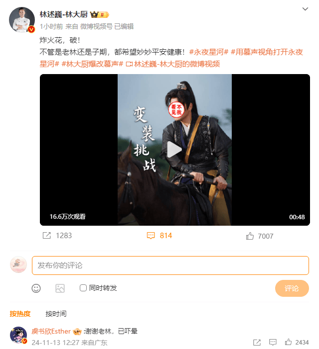 搜狐娱乐讯 11月13日,《中餐厅》的林大厨晒出爆改慕子期的视频,为虞书欣新剧《永夜星河》打call,并配文“炸火花,破!不管是老林还是子期,都希望妙妙平安健康”。随后,虞书欣现身评论区调侃:“谢谢老林,已吓晕。”