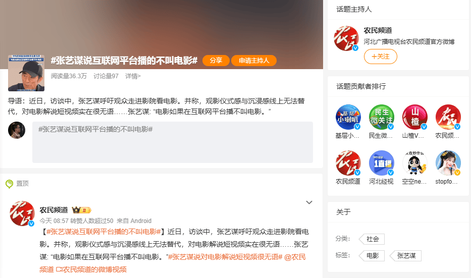 11月12日,一个热搜火爆互联网。这个热搜的名称是“张艺谋说互联网平台播的不叫电影”。热搜的发布者和“话题主持人”是“农民频道”。这个“农民频道”是蓝V认证,河北广播电视台农民频道。这个频道很多河北省之外的观众不了解。它是河北台的一个地面频道。