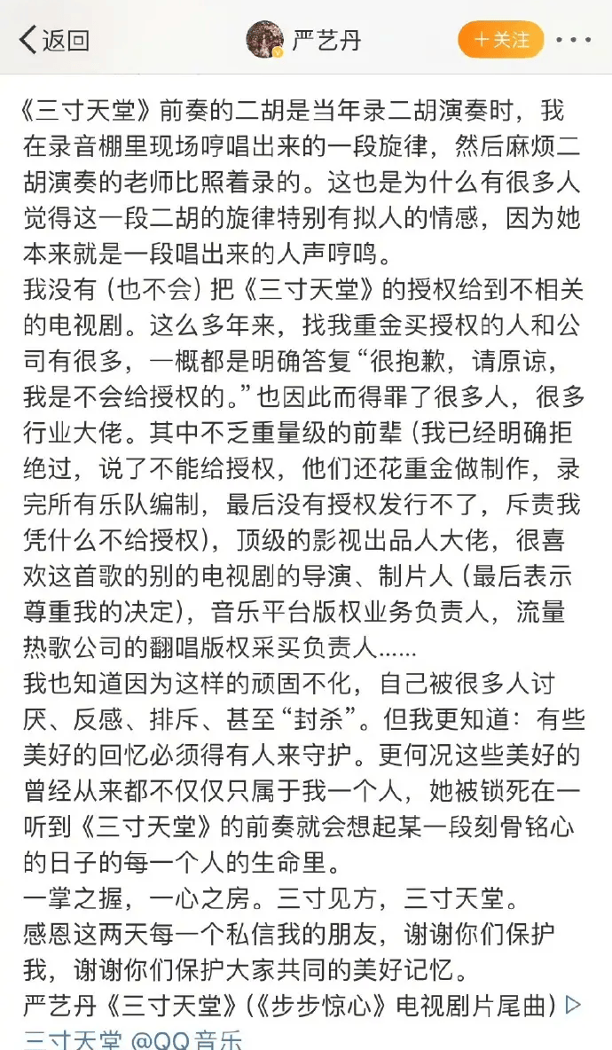 搜狐娱乐讯 近日,有网友发现《永夜星河》一首插曲中的某一段旋律很像《三寸天堂》。对此,《三寸天堂》原唱严艺丹发文称:“我没有(也不会)把《三寸天堂》的授权给到不相关的电视剧。” 但目前这条回应在严艺丹主页已经不可见。