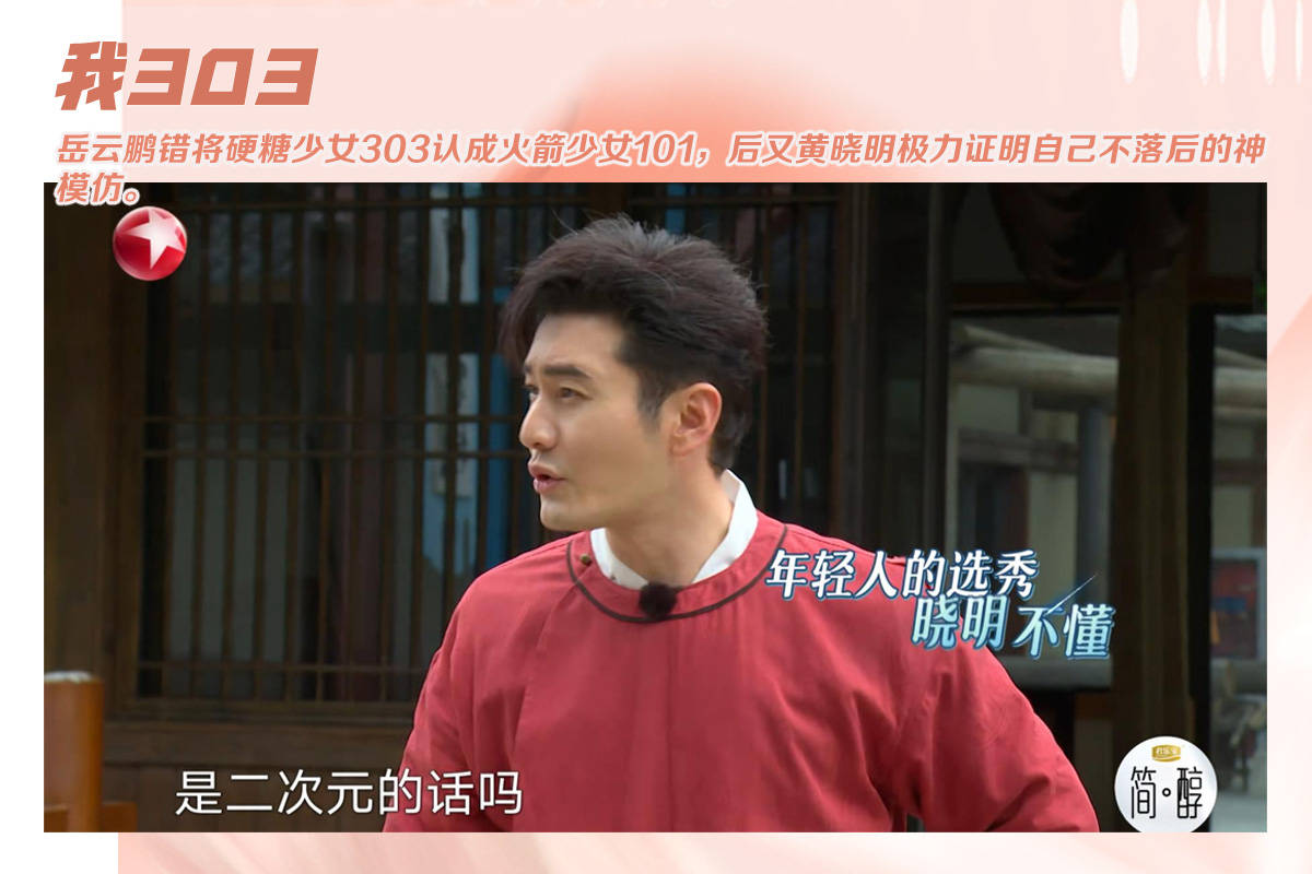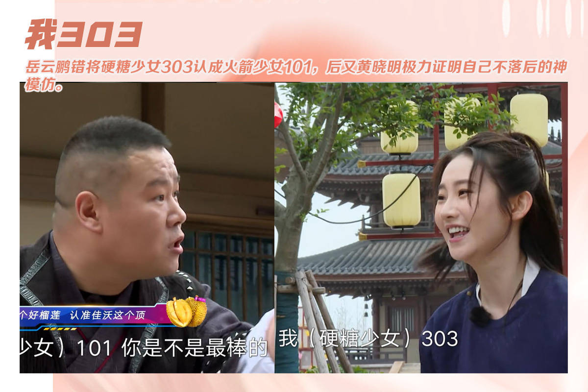 岳云鹏一时嘴快,将张艺凡所在的组合硬糖少女303,说成了火箭少女101,后面犹如综艺之神降临的黄晓明更是将该名场面推向了新的高度。