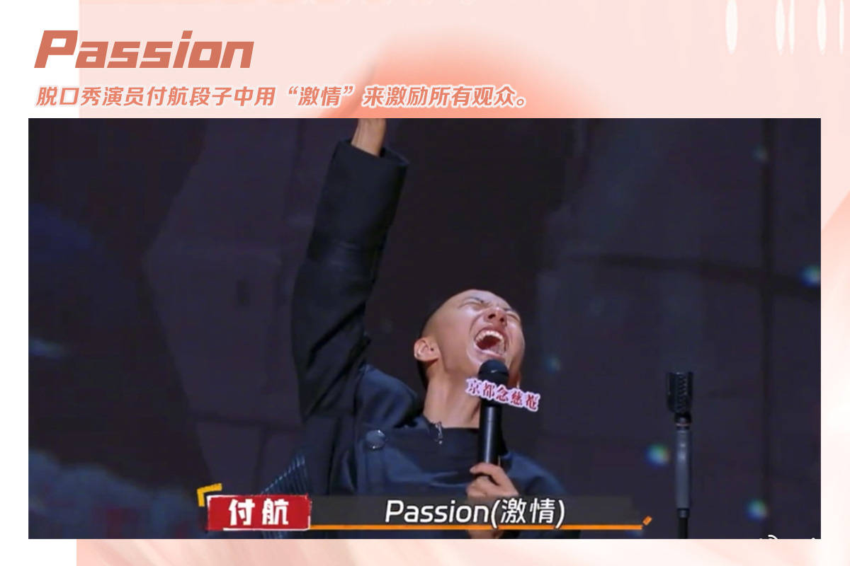 本年度的最强喜剧人付航和他的名场面“passion”令很多人记忆深刻,在他的表演里充满着对自我的调侃和反省,少了很多焦虑和不安,并且最终他以高喊一句“passion”结束整场表演,以饱满的热情带动现场观众,“passion”也就成了2024年的年度词汇。