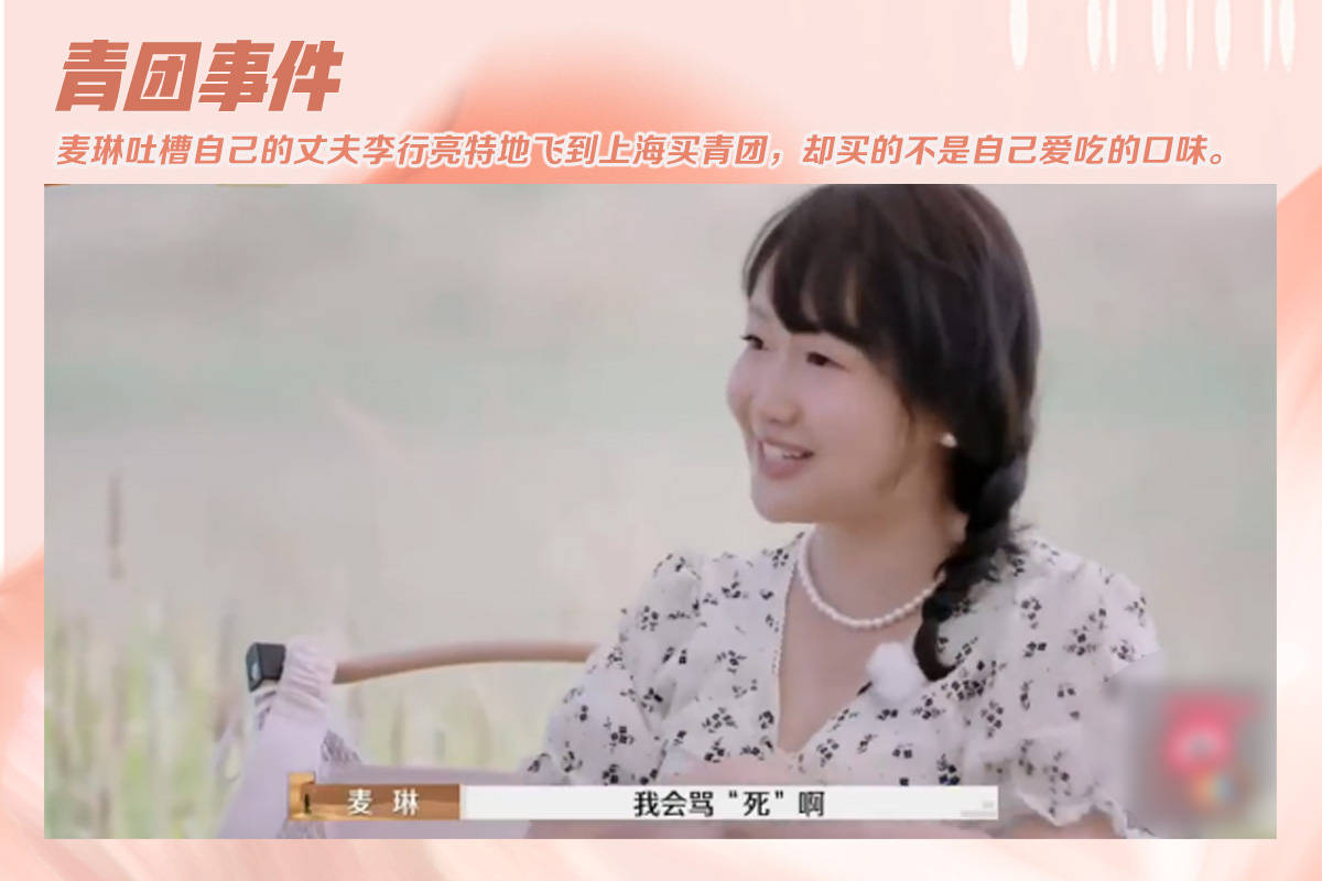 杨子在前两期因为对妻子黄圣依态度不佳引发网友批评,如今热度已经被一位素人顶替,那就是李行亮的妻子麦琳。以她为主导的“青团事件”和“熏鸡事变”成为了互联网热门话题,这就让本狐带着大家了解下这两个名场面。