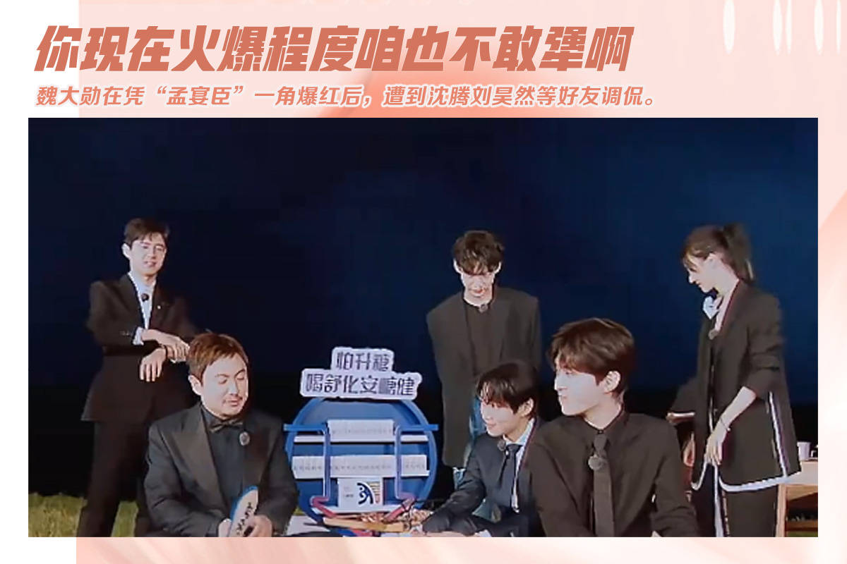 2023年《我的人间烟火》中孟宴臣一角让魏大勋一夜之间人气飞升,在综艺上他被自己的好友刘昊然白敬亭贴脸开大,模仿剧中名场面,更有被沈腾调侃“太红了,不敢蹭热度”,众人的调侃和魏大勋的局促成就综艺名场面。