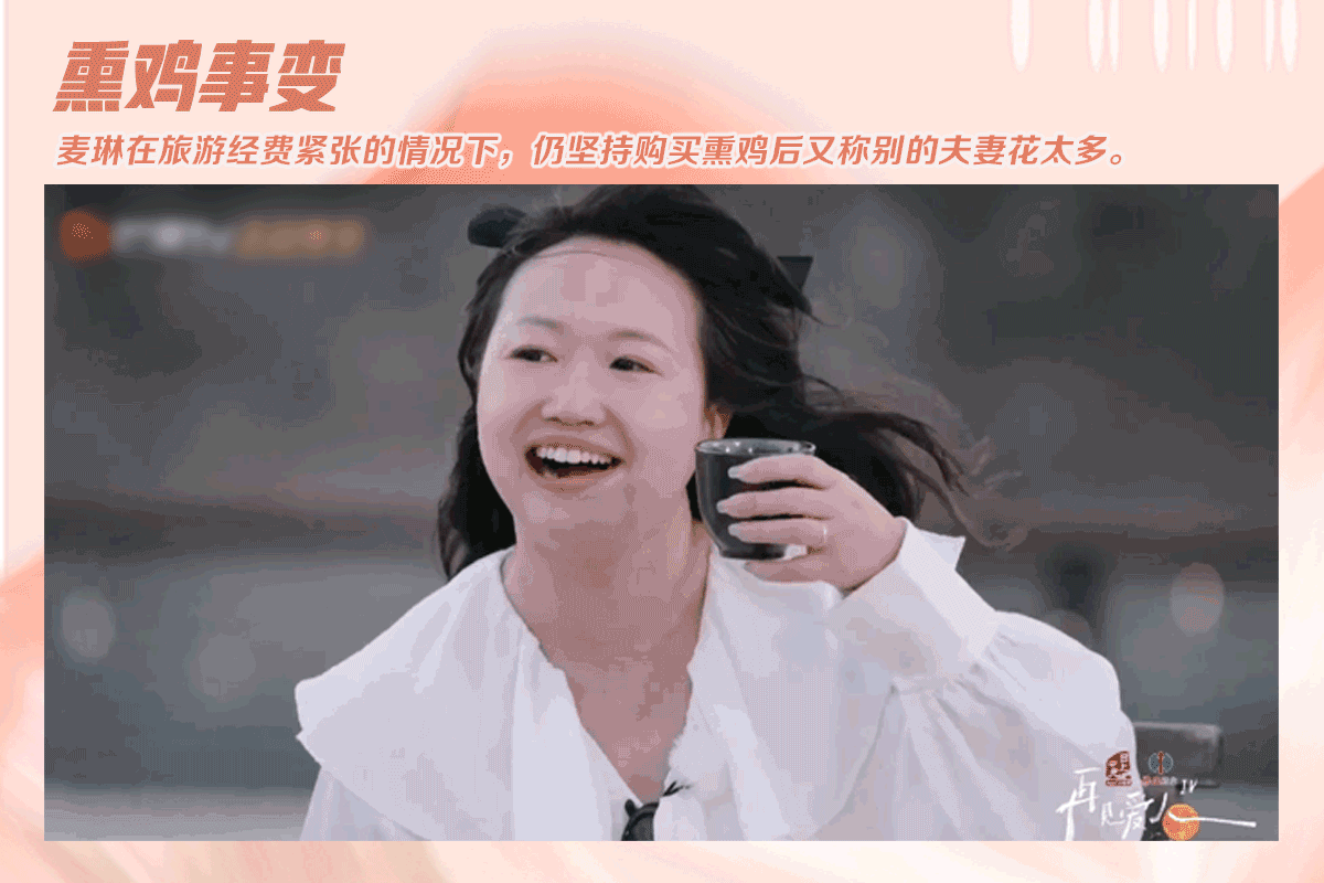 随后,便爆发了节目播出后最大一次争议,即“熏鸡事变”。在节目中,需要每对夫妻轮换成为导游,麦琳李行亮作为第一期的导游,在其他人购买东西时,麦琳不断提醒和纠正大家:“我们的钱不多”,对经费的控制欲极高,在另一组嘉宾留几手提出买烟需求也被她拒绝,让网友们觉得她对金钱过于焦虑。