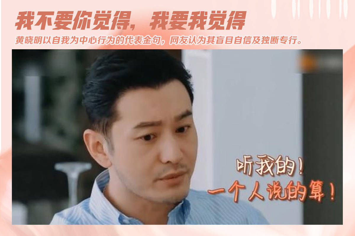 在美食综艺节目《中餐厅》里,黄晓明作为“店长”在有关餐厅菜式、采购等事情上,常常不顾及其他人的意见,发表自己的看法。随即,黄晓明在节目中的“经典”台词“我不要你觉得,我要我觉得”“这个事情不需要讨论”“听我的,我说了算”“你别干了”等等,迅即在网上流传开来。