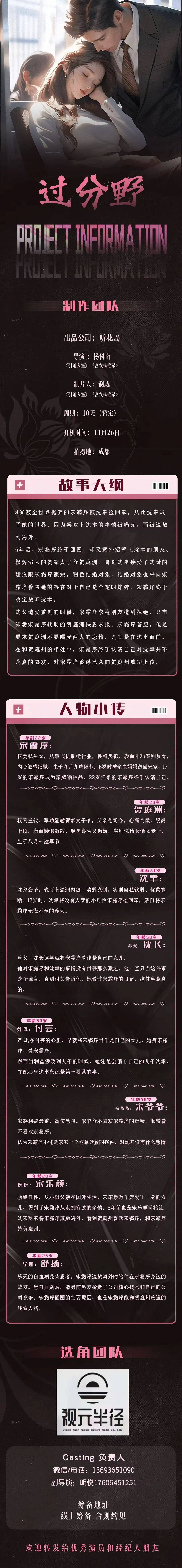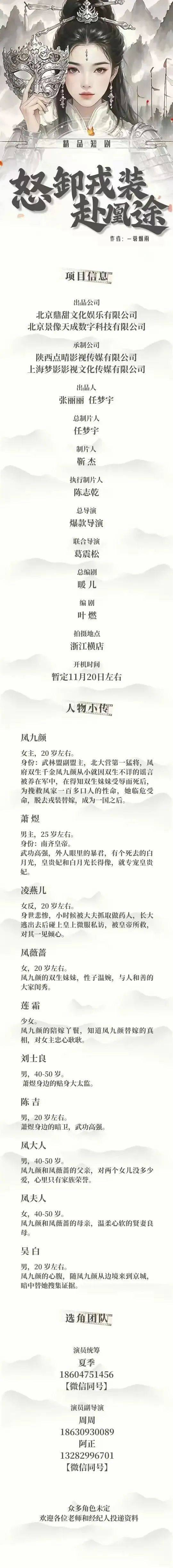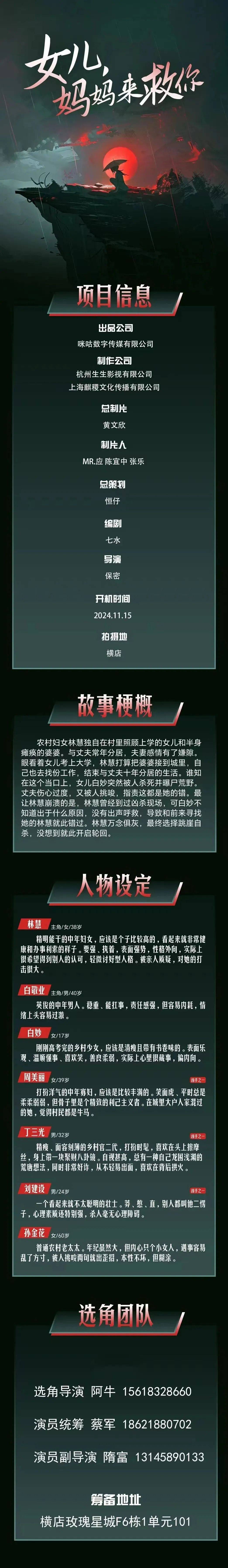免责声明:戏客Seeker公众号(“本平台”)中全网组讯的信息、内容(“组讯信息”,包括但不限于影视项目名称、项目介绍信息、出品公司信息、导演信息、选角团队信息、拍摄相关信息、联系方式等)均来源于内容信息相关方提供或互联网公开信息。本平台不对组讯信息的真实性、准确性、完整性、及时性、关联性、适用性及安全性提供任何明示或默示的担保。请您谨慎参考或使用组讯信息,并确保您的人身、财产安全,本平台不对您使用或参考组讯信息而造成的后果承担任何责任。