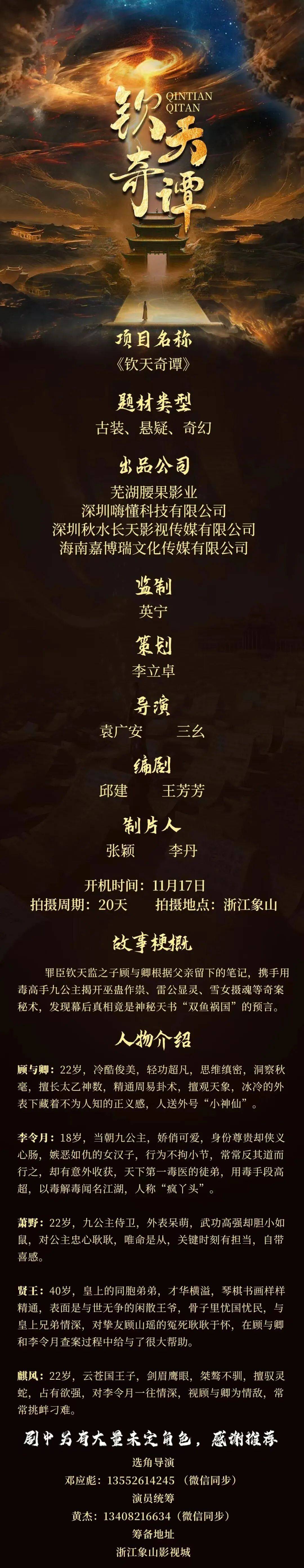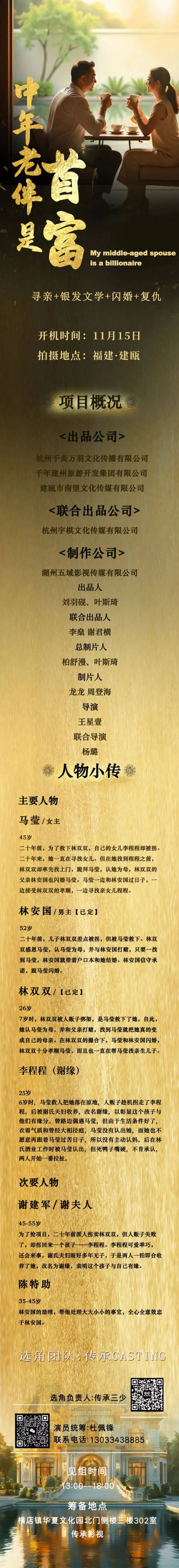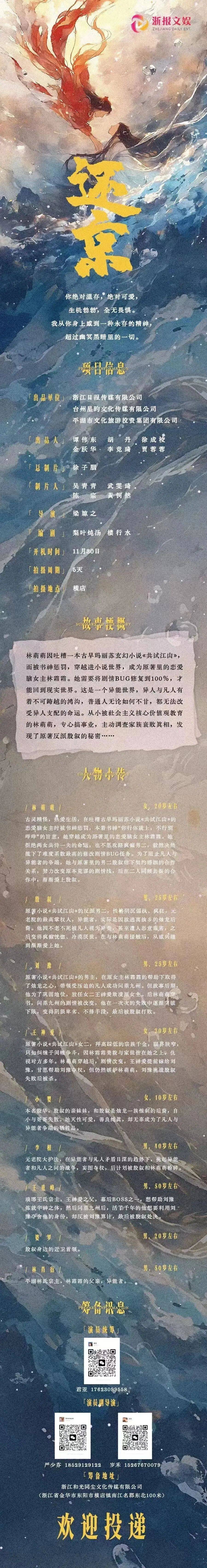 免责声明:戏客Seeker公众号(“本平台”)中全网组讯的信息、内容(“组讯信息”,包括但不限于影视项目名称、项目介绍信息、出品公司信息、导演信息、选角团队信息、拍摄相关信息、联系方式等)均来源于内容信息相关方提供或互联网公开信息。本平台不对组讯信息的真实性、准确性、完整性、及时性、关联性、适用性及安全性提供任何明示或默示的担保。请您谨慎参考或使用组讯信息,并确保您的人身、财产安全,本平台不对您使用或参考组讯信息而造成的后果承担任何责任。