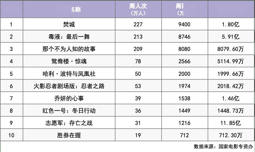上周(2024/11/4-11/10)共收获4.26亿票房,环比下降11%。周票房前三名分别为《焚城》《毒液:最后一舞》及《那个不为人知的故事》,三部影片在周票房占比上的差距并不大,皆在20%左右。