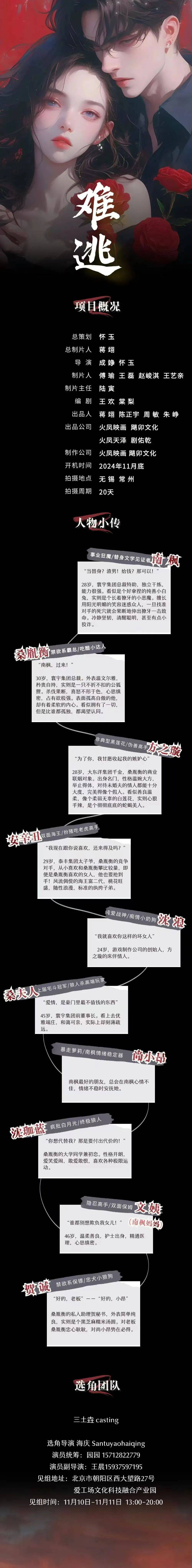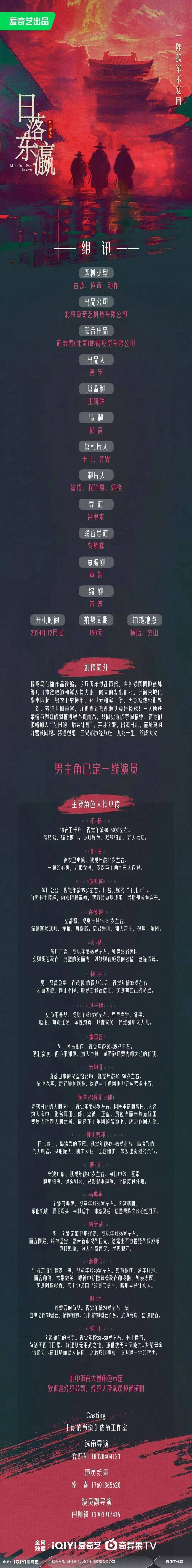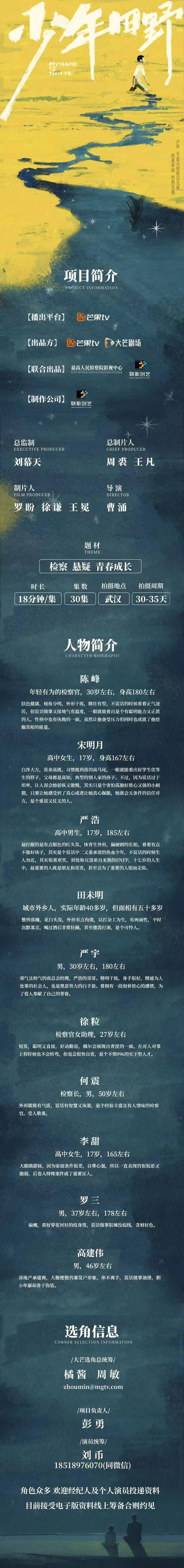 剧中大量角色未定,欢迎各经纪公司、经纪人及演员投递资料。