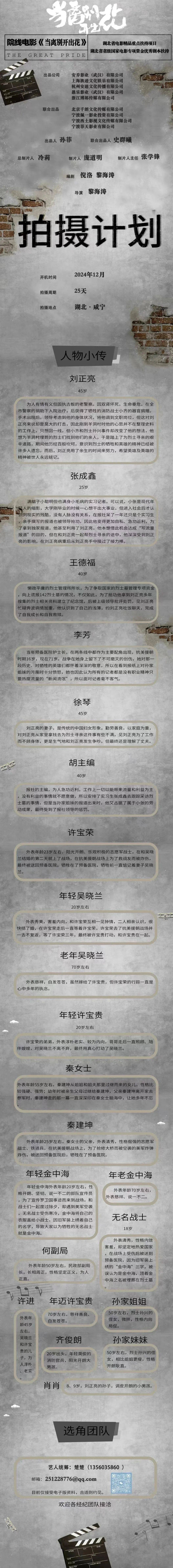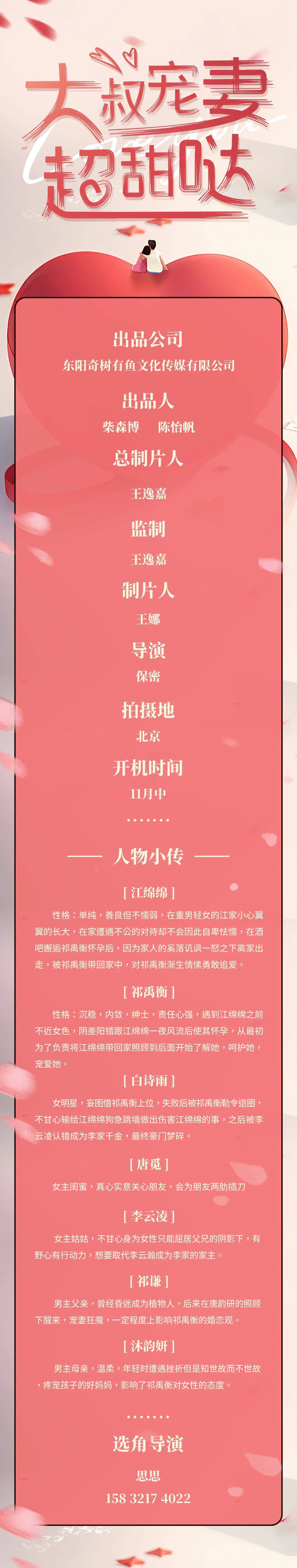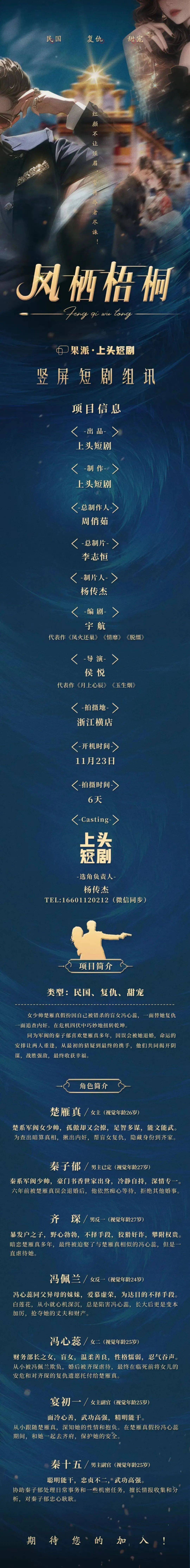 剧中大量角色未定,欢迎各经纪公司、经纪人及演员投递资料。