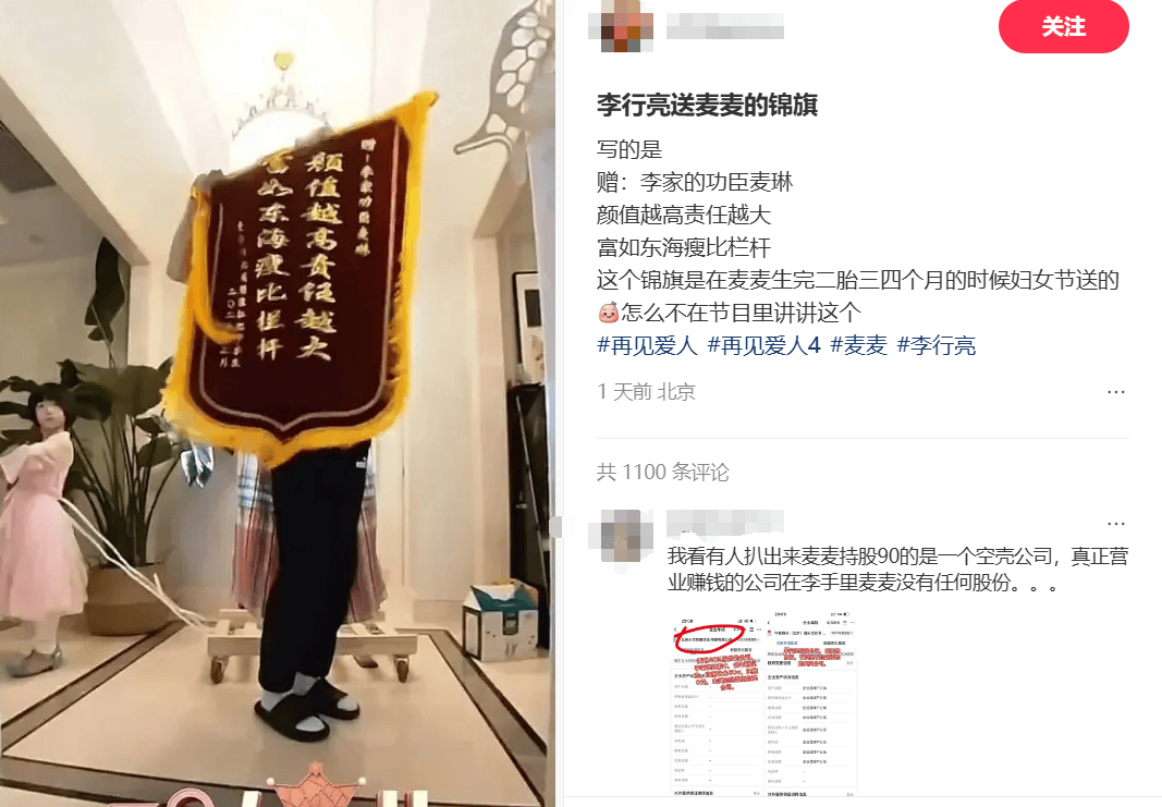 网友扒出李行亮曾经在麦琳二胎得子后,送过一面锦旗。