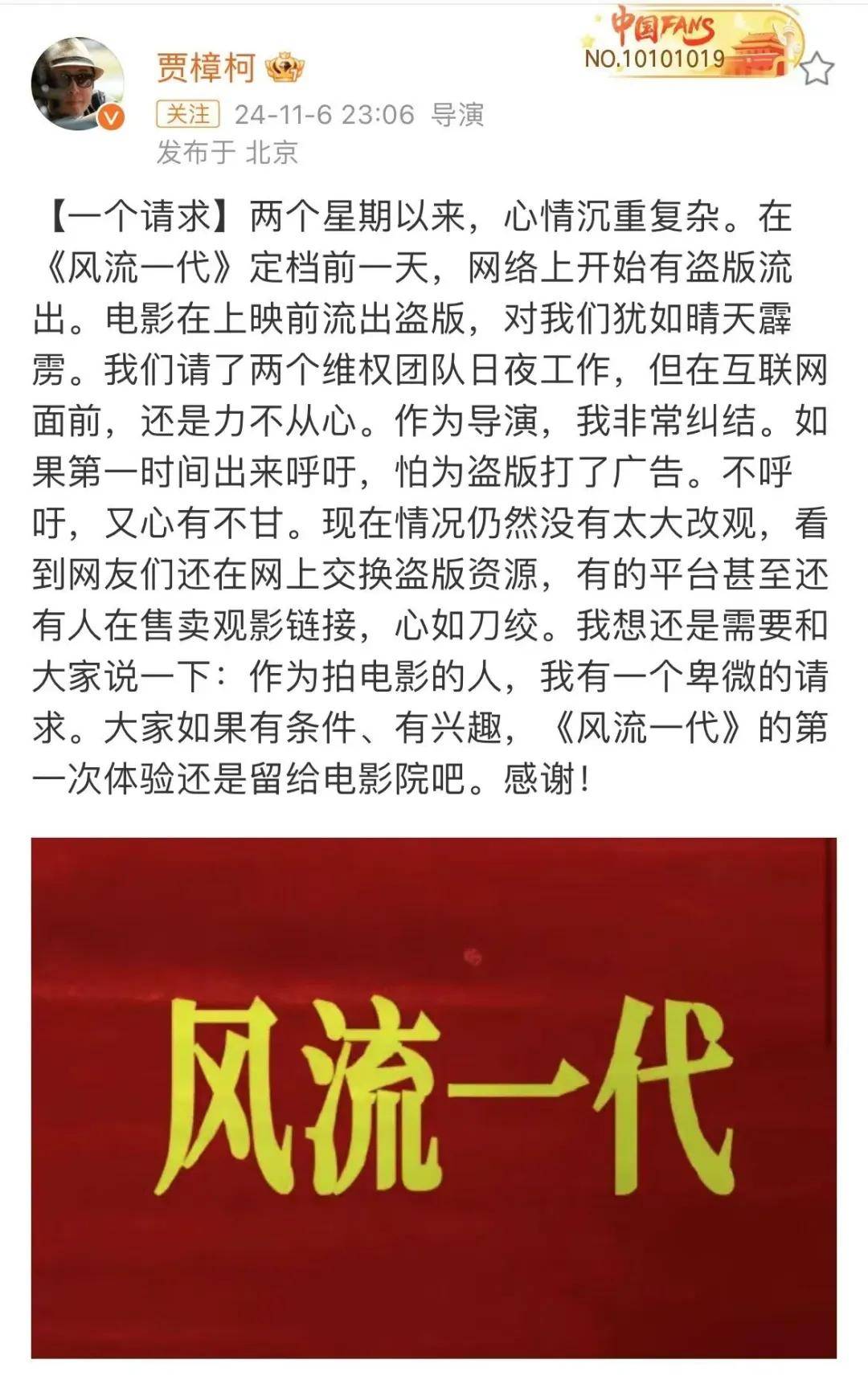 【一个请求】两个星期以来,心情沉重复杂。在《风流一代》定档前一天,网络上开始有盗版流出。电影在上映前流出盗版,对我们犹如晴天霹雳。我们请了两个维权团队日夜工作,但在互联网面前,还是力不从心。作为导演,我非常纠结。如果第一时间出来呼吁,怕为盗版打了广告。不呼吁,又心有不甘。现在情况仍然没有太大改观,看到网友们还在网上交换盗版资源,有的平台甚至还有人在售卖观影链接,心如刀绞。我想还是需要和大家说一下:作为拍电影的人,我有一个卑微的请求。大家如果有条件、有兴趣,《风流一代》的第一次体验还是留给电影院吧。感谢!