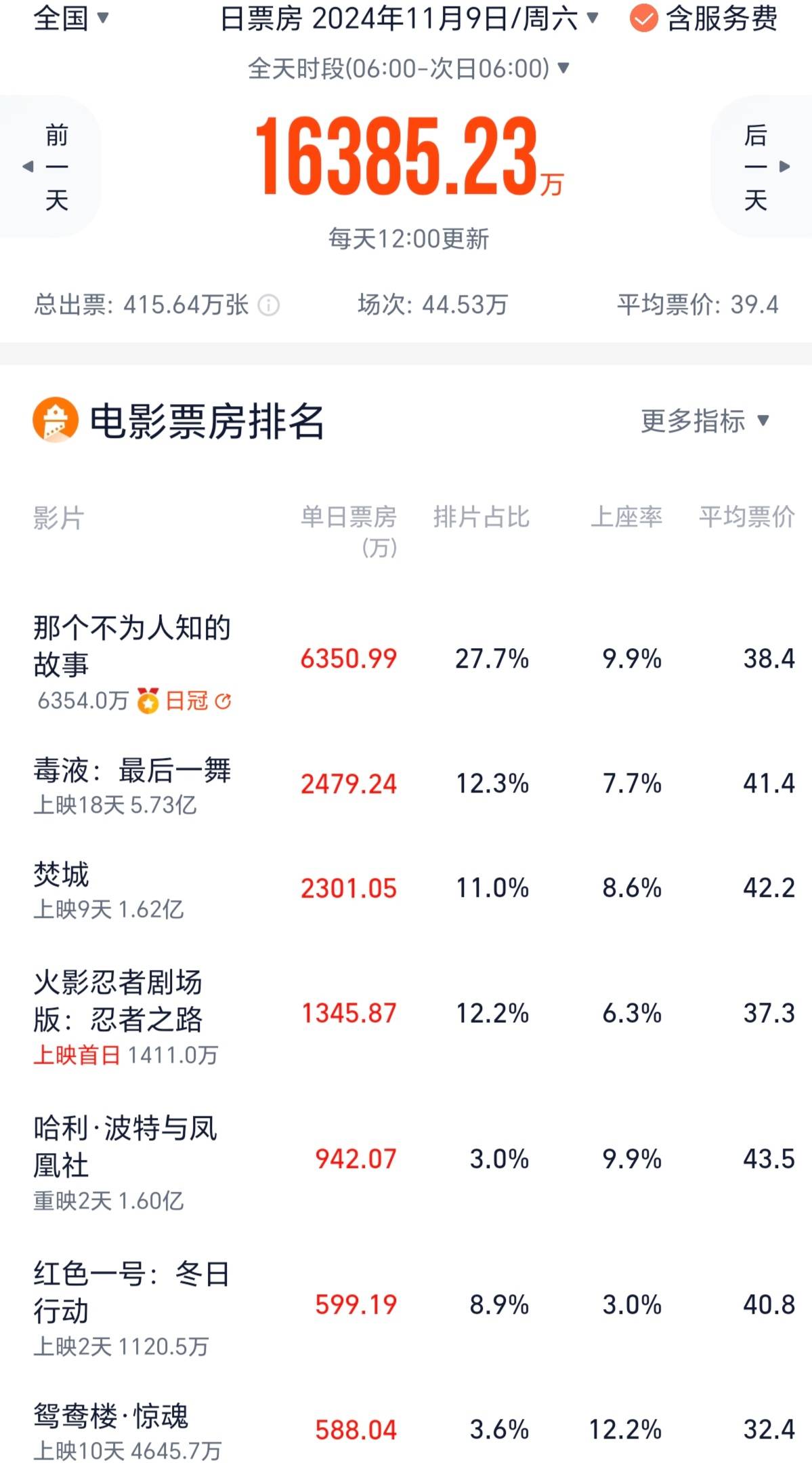 老片中,《毒液3》重新超过《焚城》,排在日榜第二,《焚城》居第三。《毒液3》上映18天累计票房5.73亿元,《焚城》上映9天累计票房1.62亿元。