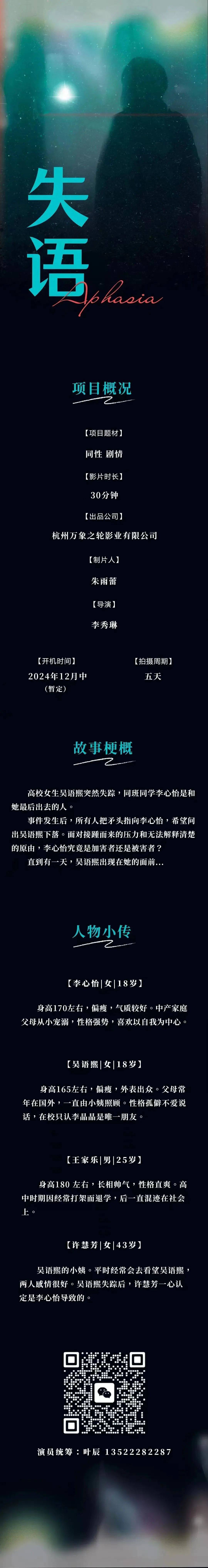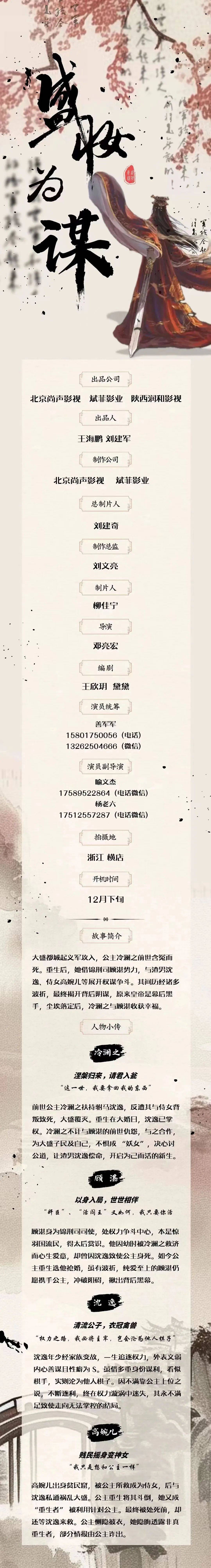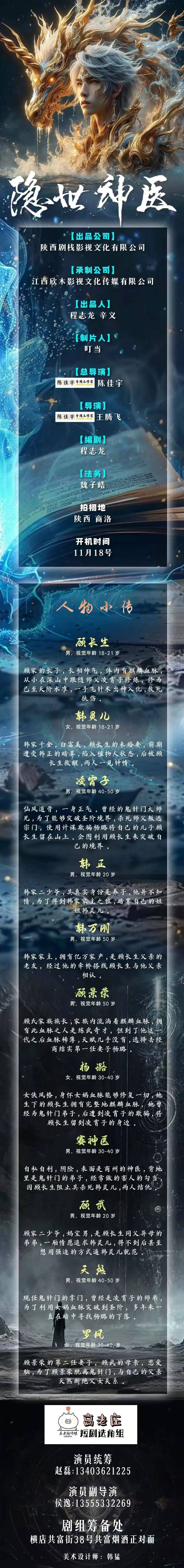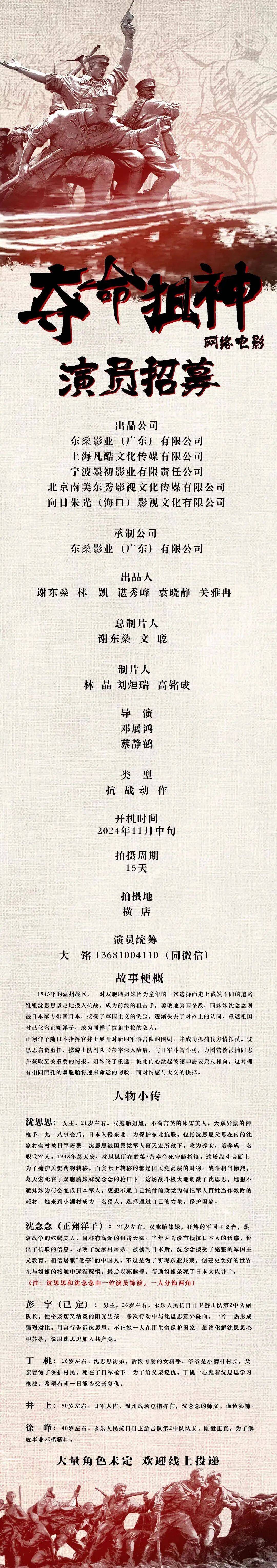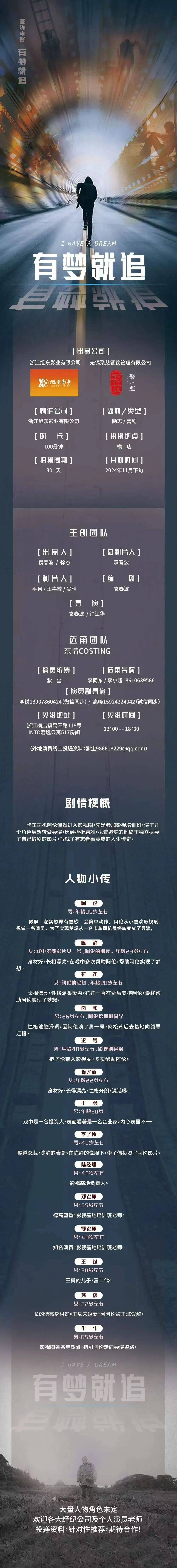 免责声明:戏客Seeker公众号(“本平台”)中全网组讯的信息、内容(“组讯信息”,包括但不限于影视项目名称、项目介绍信息、出品公司信息、导演信息、选角团队信息、拍摄相关信息、联系方式等)均来源于内容信息相关方提供或互联网公开信息。本平台不对组讯信息的真实性、准确性、完整性、及时性、关联性、适用性及安全性提供任何明示或默示的担保。请您谨慎参考或使用组讯信息,并确保您的人身、财产安全,本平台不对您使用或参考组讯信息而造成的后果承担任何责任。