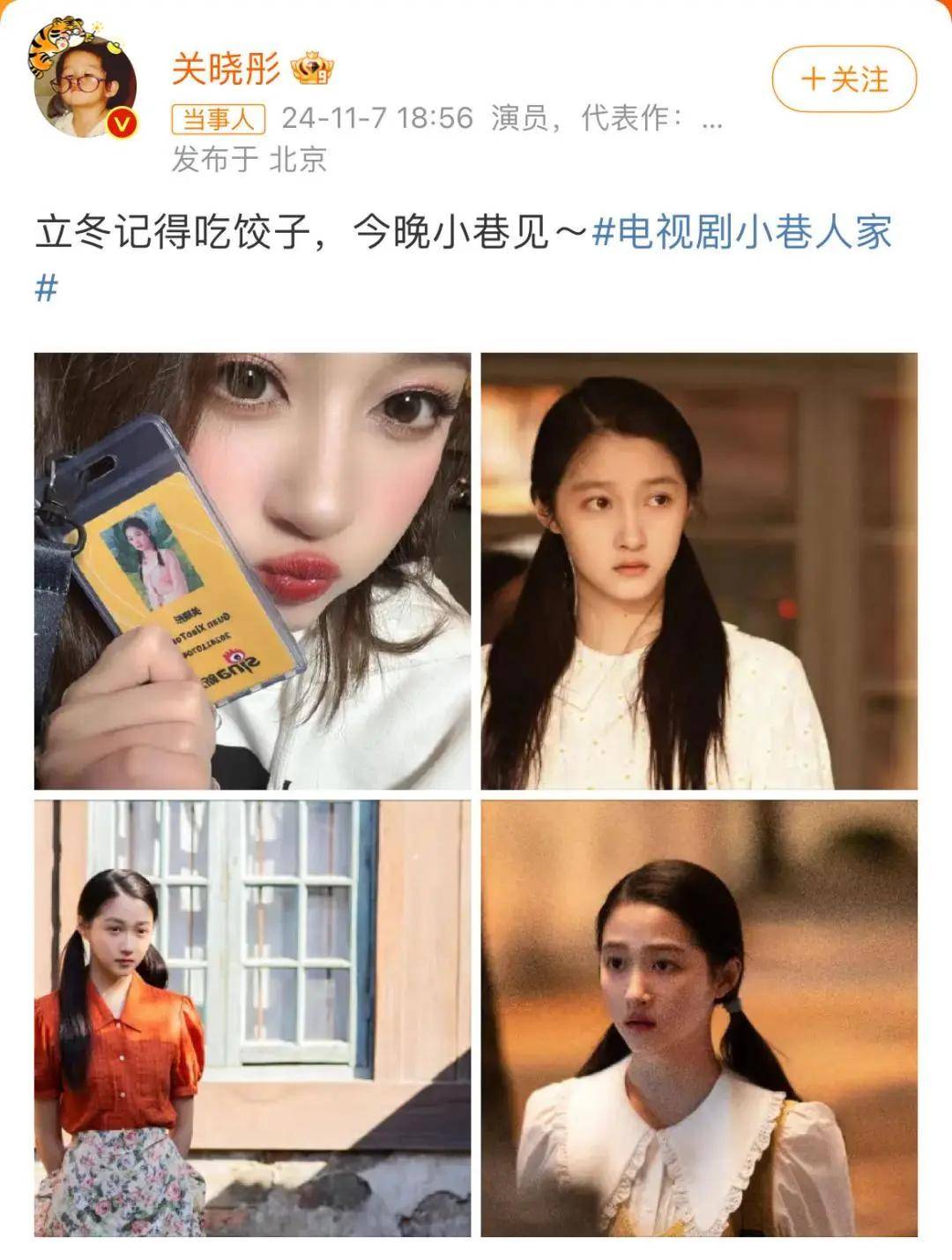 11月7日18时56分,关晓彤发布微博宣传自己的新剧《小巷人家》,她写道;“立冬记得吃饺子,今晚小巷见”