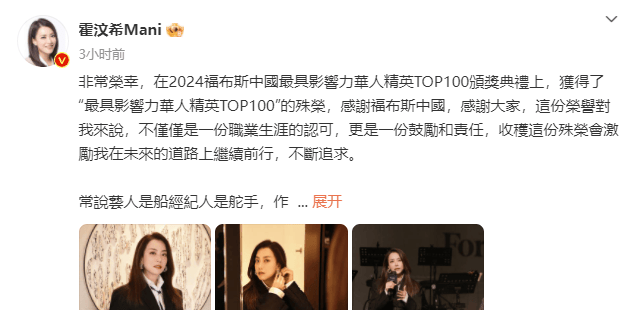 搜狐娱乐讯 11月8日,霍汶希发长文分享入选2024福布斯中国最具影响力华人精英TOP100领奖后的心情,表示“艺人是船经纪人是舵手”,而自己“从不后悔选择了经纪人行业”,并提到自己也会继续努力,挖掘新人,创办英皇演艺学堂,为娱乐圈输送新鲜血液,Mani好棒!