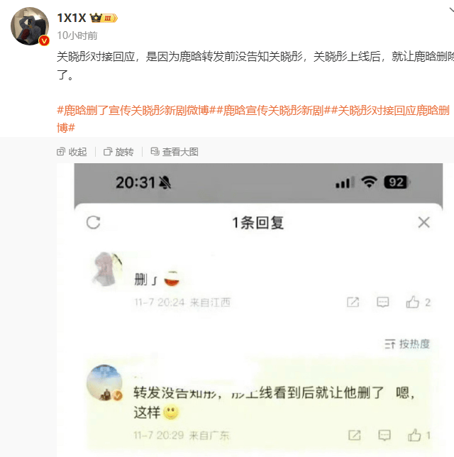 随后,关晓彤对接回应删的原因:“鹿晗转发没有告诉关晓彤,关晓彤上线看到之后就让他删了”。