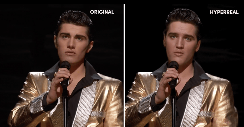 Metaphysic甚至用同样的技术,主导了一场全程用换脸模型对外展示的音乐会场景。在2022年《美国达人秀》(AGT)上,Metaphysic展示了 AI 生成的摇滚巨星猫王,整个过程由动捕演员的表演和训练的猫王模型实时直出,直接打在了电视屏幕上。