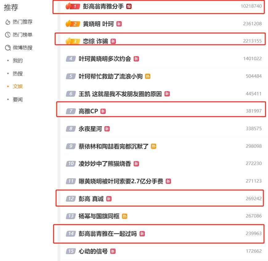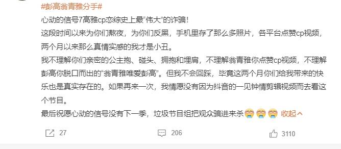 眼看着外界对两人的质疑声越来越大,翁青雅和彭高于11月7日同一时间发长文官宣分手,意味着“高雅”CP彻底be了,不仅引得超多节目粉不满,磕生磕死的CP粉更是情绪激动。随即将“恋综 诈骗”、“翁青雅唯爱彭高”以及“彭高真诚”等相关词条推上了热搜。