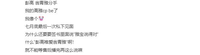 其实,之所以有那么多CP粉坚信“高雅”CP是真的,也并非全无原因,毕竟翁青雅和彭高不仅在节目中暧昧不断,收官时也官宣了,在线下签售也表现得非常亲密,各种极限拉扯,再加上翁青雅持续给CP粉点赞,让人误以为他们只是慢热。但随着更多线下日常曝光,高雅确认零线下,彻底瞒不住了。