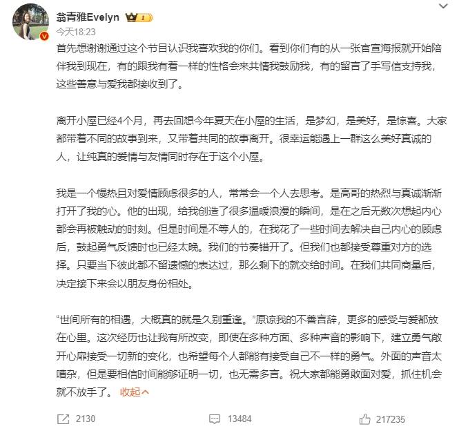 按照翁青雅的发文,她是一个非常慢热的,彭高确实敲开了她的心,但是时间不等人,当她想要回馈时已经晚了,最终经过讨论决定以朋友的身份相处。不得不说,慢热可以理解,但是翁青雅强调的时间不等人却有些推脱的意思,毕竟按照彭高对她的喜爱,就算等久一点也不是问题,唯一的解释就是翁青雅确实不喜欢彭高罢了。