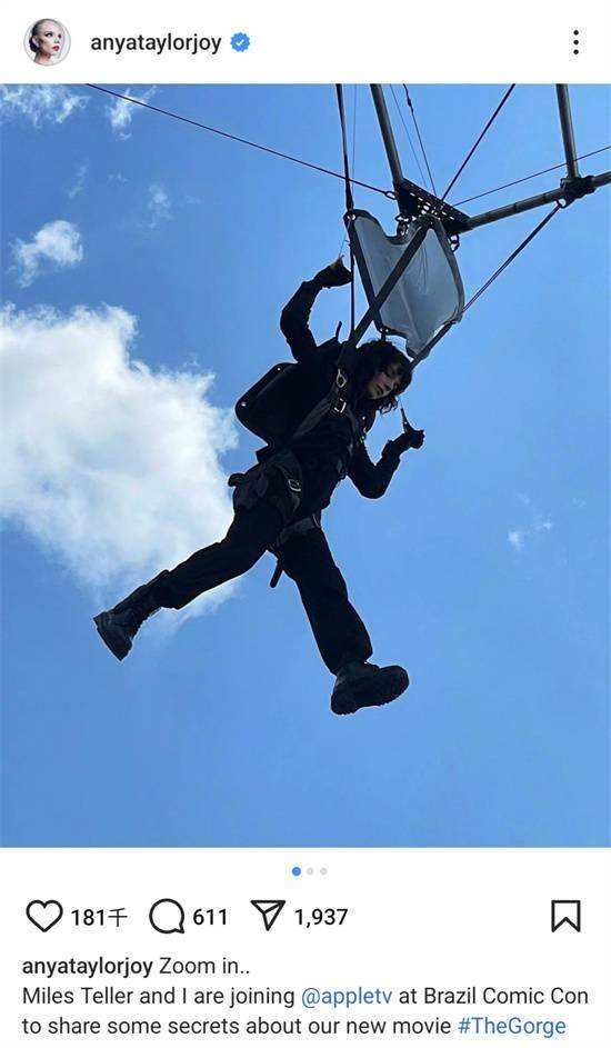 1905电影网讯 近日,女星发布一组其主演的电影《峡谷》幕后照片,并宣布电影将亮相巴西圣保罗漫展,安雅·泰勒-乔伊和两位主演将出席宣传。幕后照中的安雅一身劲装拍摄跳伞戏码,魅力十足。