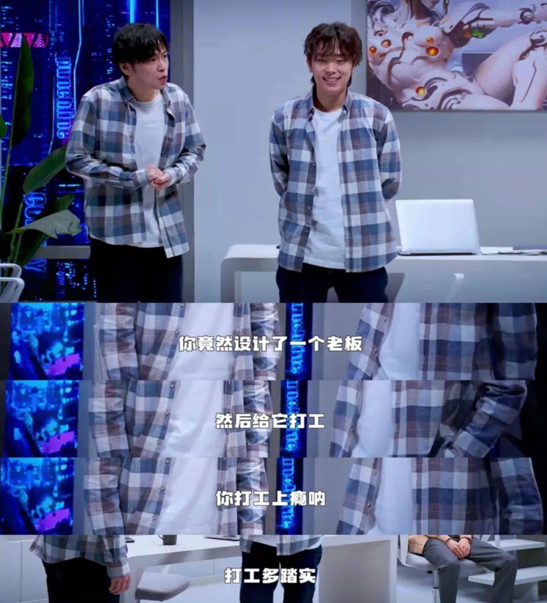 《人工智能之死》里几个人物的几度反转令人印象深刻——起初程序员小汪被疑是AI,资本家发现其异常行为当面拆穿他,谁知“李飞”这名资本家才是被小汪制造出来甘愿为其打工的AI。当人类内卷到主动制造资本家AI并甘愿为其打工,这种next level的高级讽刺是过往喜剧作品里很不常见的深度表达。