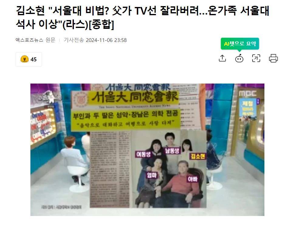 对于,韩星金素贤透露“明星学霸家族”,家里每个人都是首尔大学毕业生,她的爸爸和弟弟是首尔大学医学院教授,而她、妈妈和妹妹则是首尔大学音乐学院出身。令人惊讶的是,家里每个人都拥有硕士学位以上的学历,大家怎么看呢?