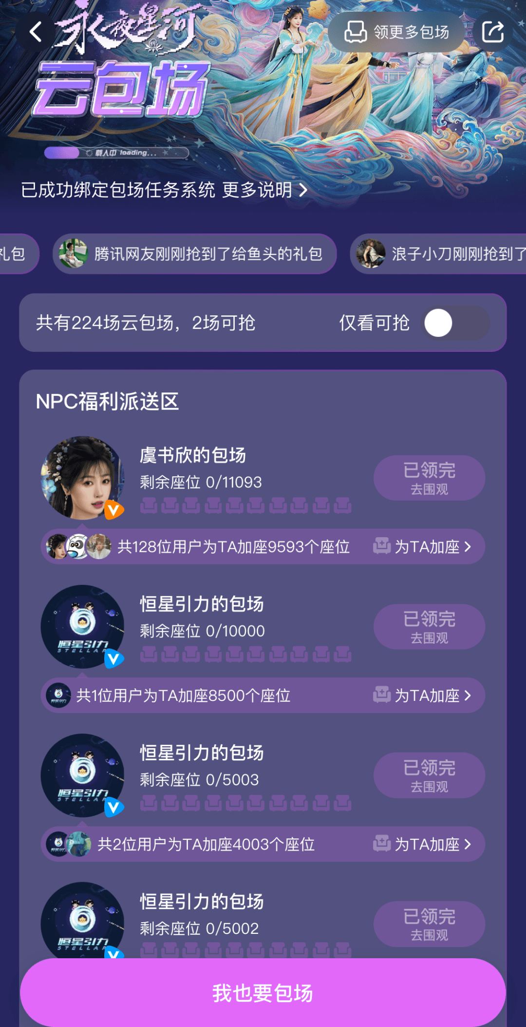 这波热播新剧中,《永夜星河》的云包场尤为引人关注,开播当天虞书欣慷慨为剧集云包场1万座,话题#虞书欣永夜星河云包场#更是引发热议和高频转发,昨日王耀庆出资45000元支持该剧的云包场活动又带来新一轮热度;此外虞书欣、丁禹兮、祝绪丹、杨仕泽等剧中其他演员以及该剧制作方恒星引力也皆提供了相当数量包场座位,但粉丝们依然表示一“座”难求。