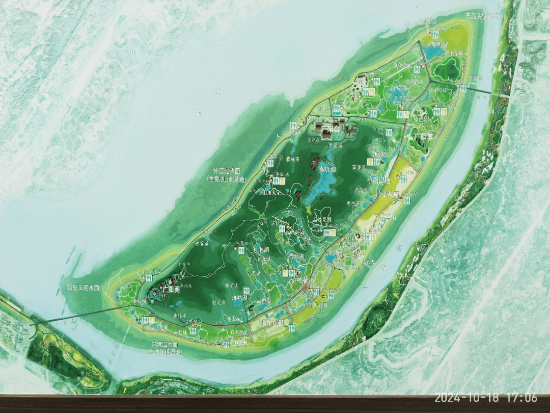 重庆广阳岛示意图,图中的广阳台为会展中心及2个酒店建筑群,广阳阁为长江书院,广阳墩为大河文明馆。投资庞大的长江干部培训中心(后更名为长江生态文明干部学院)及长江生态环境学院位于岛东头(图右)的南岸处 程维摄
