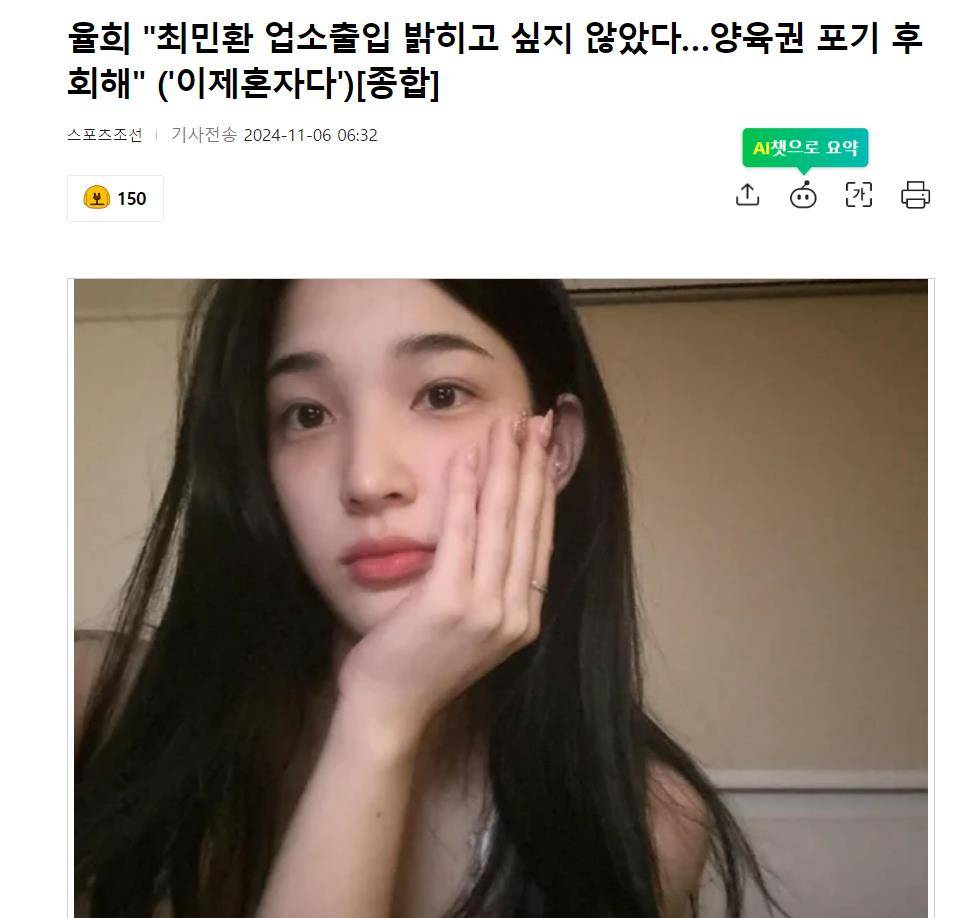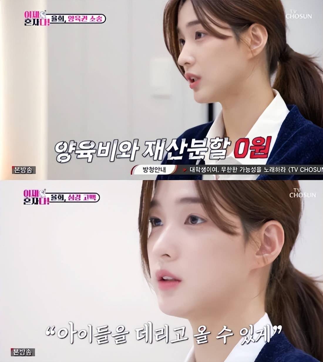 节目中,她更首次提及前夫崔珉焕的娱乐场所出入的事情,并表示自己本不想公开这一切,但出于为孩子争取更好的未来,才选择在这个时候将真相揭露。她表示:“不想让任何人知道这些,但作为母亲的我别无选择。”过去的一年里,她不仅需要适应离婚后的生活,还要承受精神上的压力,一度觉得自己无比渺小和无助。